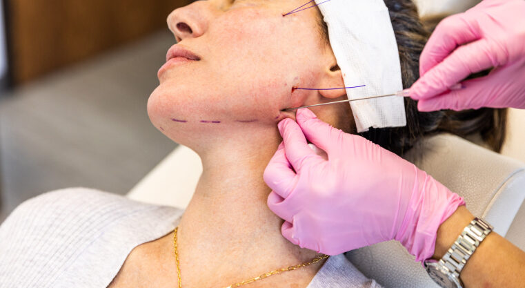 Special dissolvable threads are inserted under the skin with a fine needle or cannula. The threads anchor into the tissue and are gently pulled to lift sagging skin.